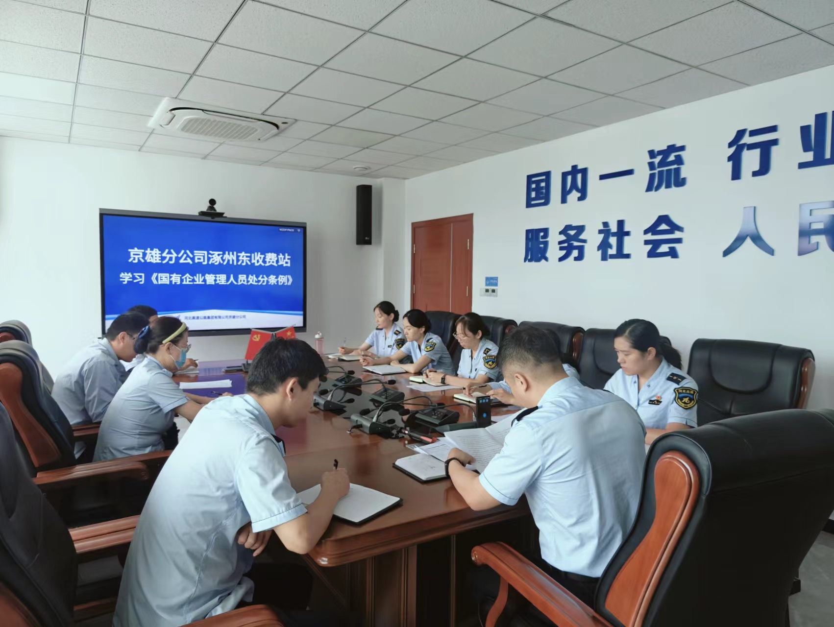 为持续推进党纪学习教育向纵深发展,进一步提升党员干部职工法治意识、规矩意识、纪律意识和廉洁意识,强化职工队伍建设,涿州东收费站组织全体党员干部职工学习《国有企业管理人员处分条例》(以下简称《条例》)。