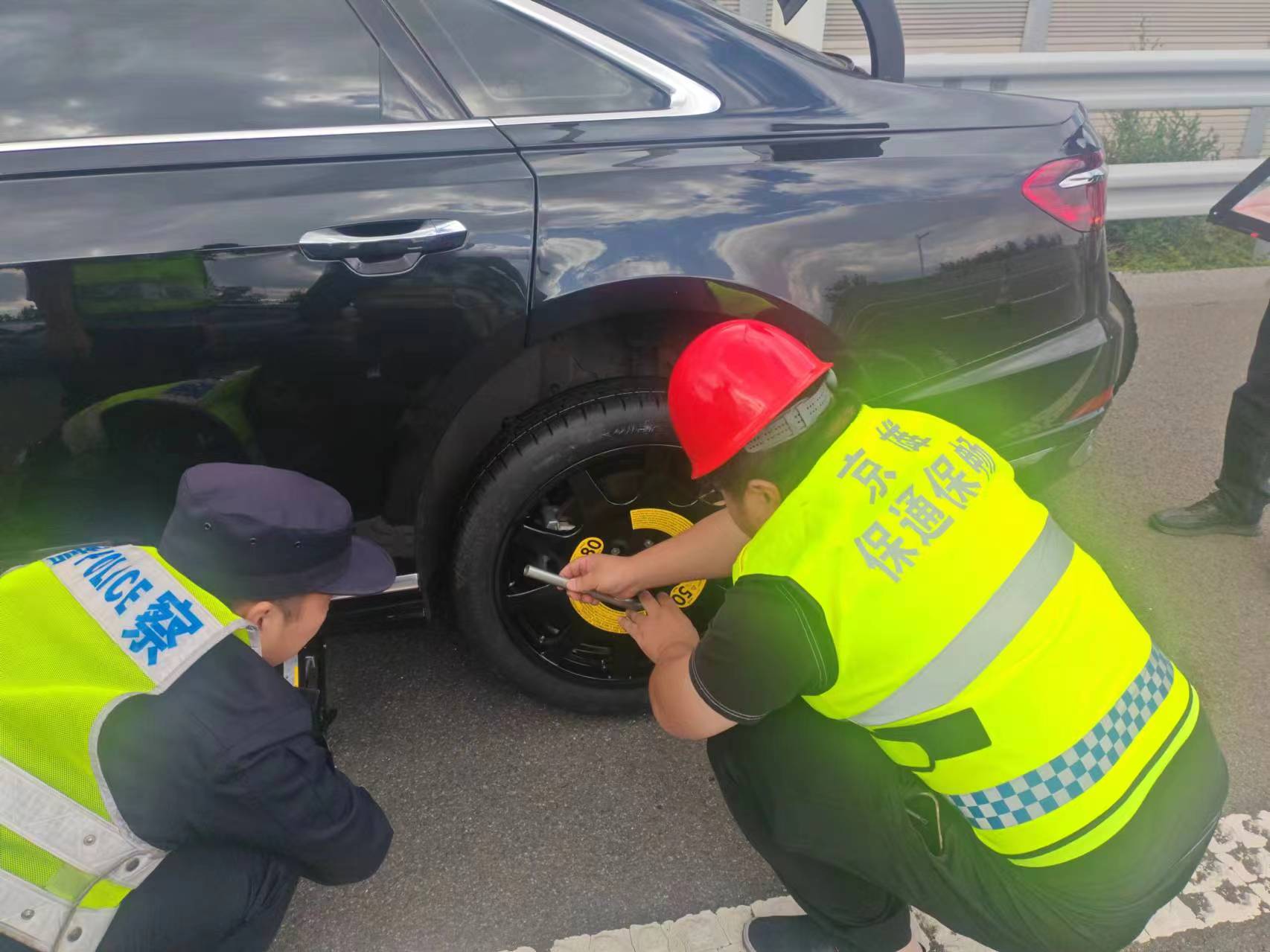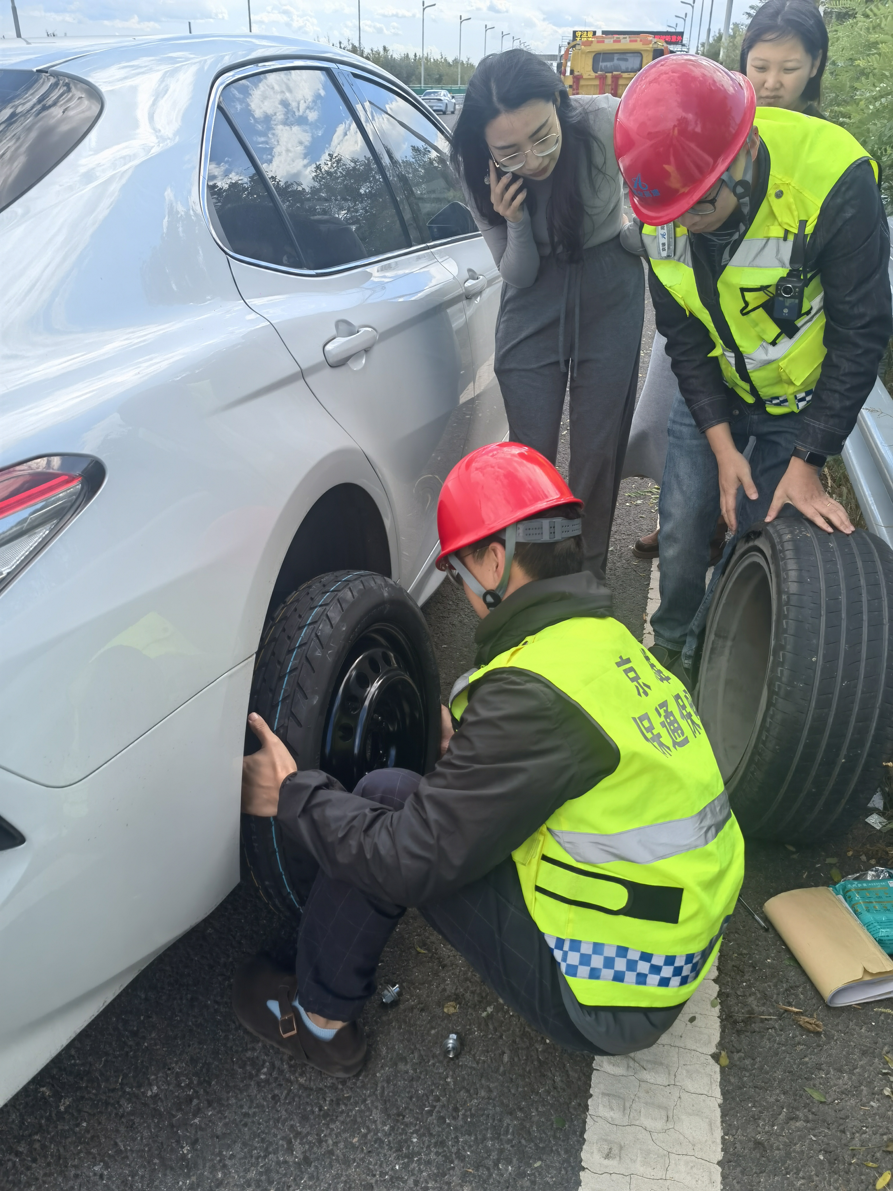 2024年10月3日下午,京雄分公司指挥调度中心外勤中队巡查中发现一辆白色轿车轮胎爆胎停靠在应急车道,打着双闪,司机在一旁焦急徘徊,十分危险。