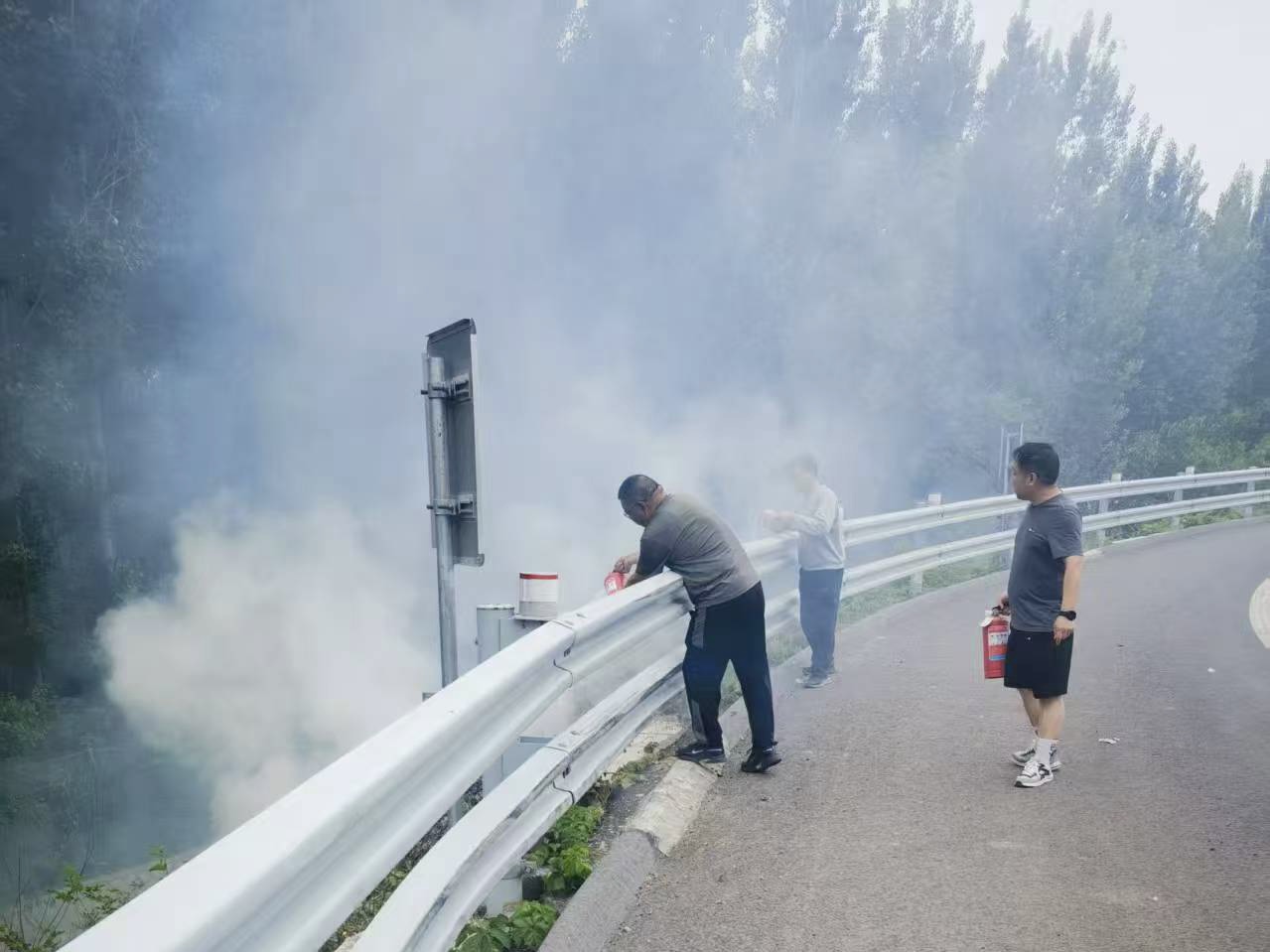 分公司值班领导刘富兵带队第一时间赶到现场,迅速启动应急预案,联系消防部门,清晰报告火情位置。经过现场勘察,发现有3处主要着火点,且边沟处有大量柳絮、树叶、垃圾,火随风势会迅速向收费站边沟周边蔓延,一旦火势进一步扩大,将对群众生命财产安全造成严重损失。在值班领导刘富兵指挥下,数名工作人员分工明确,一组人员疏导车辆绕行,维持现场秩序,确保通行车辆畅通及司乘安全;一组人员轮番使用现有灭火器材,对准火源根部持续喷射,为消防部门争取时间;另一组人员往返收费站运送灭火器材。与此同时,监控中心通过视频监控紧盯着火区域动态,与现场人员保持密切沟通,服务区工作人员持高压水枪压制火头。在多方协同作战下,16时05分火势得到及时控制,明火被成功熄灭,未造成次生灾害,有效保障了道路安全畅通。